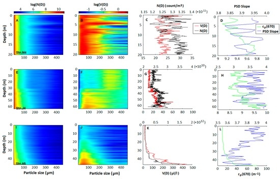 (A–L) The vertical distributions of the size-specific particle numbers and volume concentrations for each of the size bins (left two columns), total particle number and volume concentrations (the third column), and PSD slopes and cp(670) (last column) from three representative stations located in the BS ((top) Stn. M4, Stn means Station), NYS ((middle) Stn. J4), and SYS ((bottom) Stn. A5), respectively.