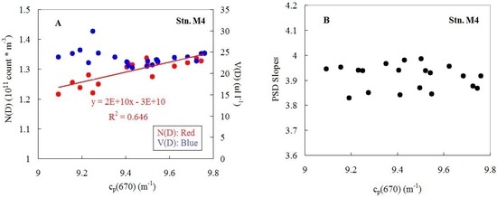 To further illustrate the vertical variability in the PSDs, three stations were selected as representatives of the various water environments (Figure 8 and Figure 9), i.e., M4, J4, and A5. These stations are located in the central regions of the BS, NYS, and SYS, respectively, with different water depths. For M4 (water depth = 20 m), N(D) and V(D) did not show apparent vertical trends, although some fluctuations were found at different water depths. The PSD slopes showed similar fluctuation patterns as N(D), ranging between 3.83 and 3.98 (mean = 3.91, SD = 0.05). Relatively stable cp(670) was observed (9.1–9.8 m−1, mean = 9.4 m−1 and SD = 0.2 m−1) but cp(670) showed a tight statistical relationship with N(D) (R2 = 0.646, p < 0.001) (Figure 9A). For J4 (water depth = 65 m), both N(D) and V(D) were stable for the upper 30 m (N(D) ~2.5 × 1010 count/m3; V(D) ~20 μL/L), and then gradually increased to the bottom. Both the PSD slopes and cp(670) showed relatively large ranges (~1.0 and 8.4–10.0 m−1, respectively), and cp(670) also showed an increasing trend from the surface to the bottom, similarly to the N(D) and V(D) profiles (Figure 8G,H). At this location, cp(670) showed close relationships with both N(D) and V(D) (Figure 9C). For A5 (water depth = 47 m), the PSD slopes showed a slightly decreasing pattern from the surface to the bottom (3.90 to 3.70). cp(670) was approximately 10 m−1 for the surface (0–30 m) waters and then rapidly increased to the bottom. Similarly to other stations, cp(670) showed tight relationships with both N(D) (R2 = 0.951, p < 0.001) and V(D) (R2 = 0.918, p < 0.001) (Figure 9E). Overall, particle concentrations showed tight relationships with cp(670), but the PSD slopes were not usually significantly correlated with cp(670) (as in Figure 9B,D,F). Additionally, it is worth noting that there are high volume concentrations of suspended particles in lower size classes in the BS compared with the NYS and the SYS (Figure 8B,E,J). This is closely linked with high content of small-sized sediments discharged by surrounding numerous rivers along the BS, which is an approximately closed inner sea. For instance, the largest river (Yellow River) of China discharged a total annual run-off of 8.88 × 1010 m3 into the BS [69], where large particles easily accumulated on the riverbed while small-sized sediments flowed into the BS [66]. In contrast, the YS is more open than the BS, and possibly influenced by terrigenous runoff at a less degree than the BS.