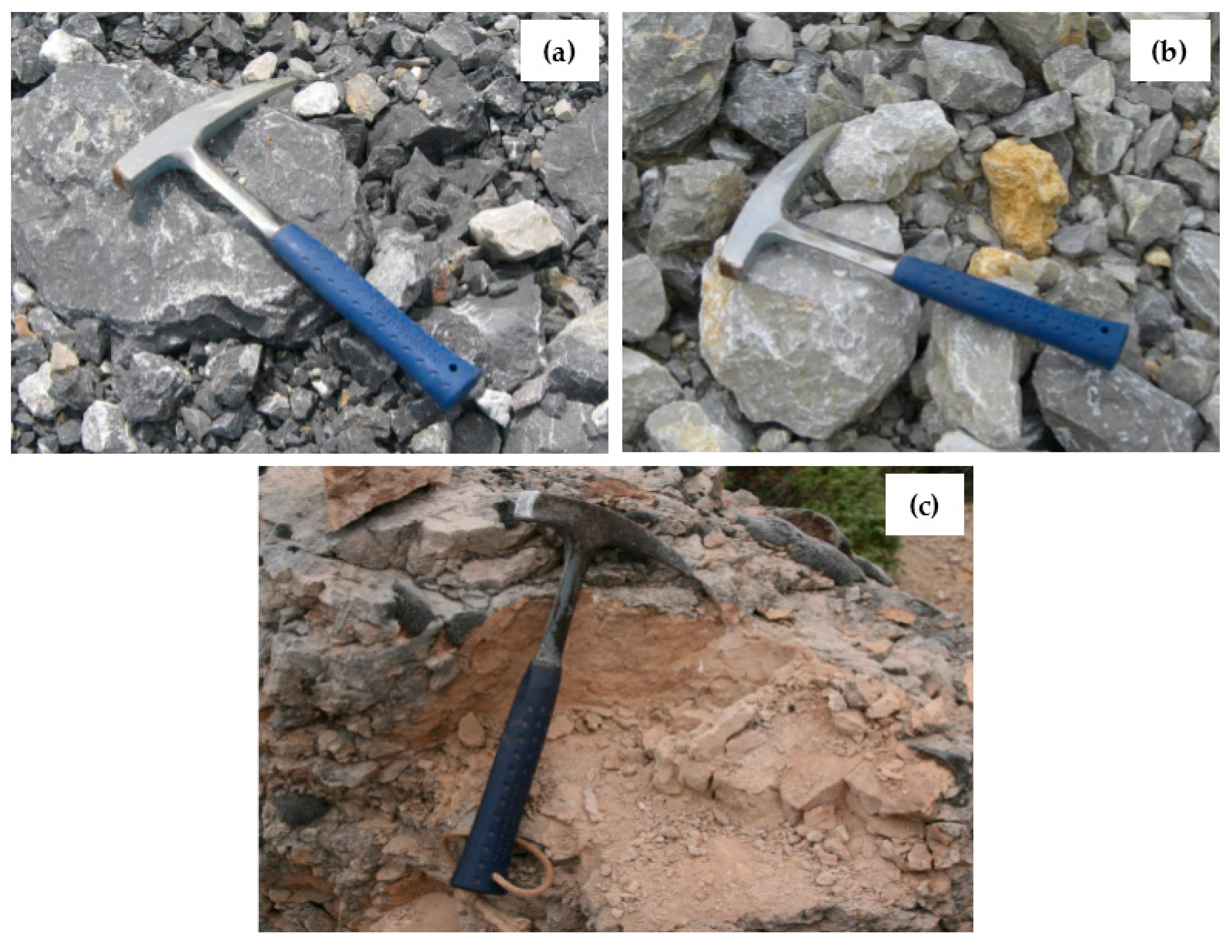 Carbonate rock samples: (a) dark gray; and (b) light gray limestone samples collected from the Lhoknga limestone quarry of PT. Lafarge Cement Indonesia, Aceh Besar, Indonesia; and (c) dolomitic limestone sample collected from the Bédarieux dolomite mine, Hérault department of the Languedoc-Roussillon region, southern France.