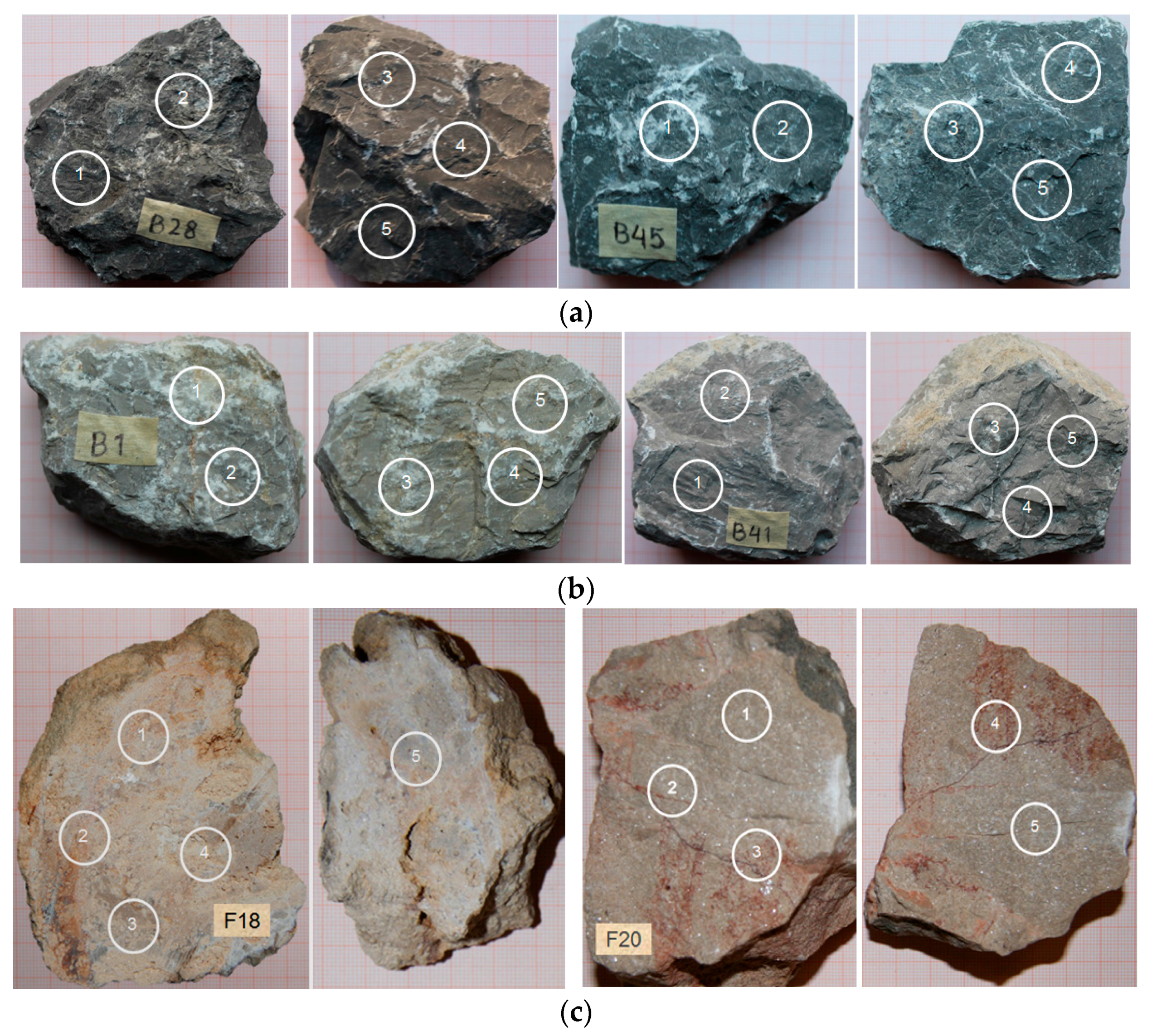 Examples of hand specimens of carbonate rock samples collected from the mines: (a) dark gray limestones (samples B28 and B45); (b) light gray limestones (samples B1 and B41); and (c) dolomitic limestones (samples F18 and F20), with white circles pointing out the locations of portable X-ray fluorescence (PXRF) and Analytical Spectral Device (ASD) spot measurements on both fresh surfaces of the rock samples.