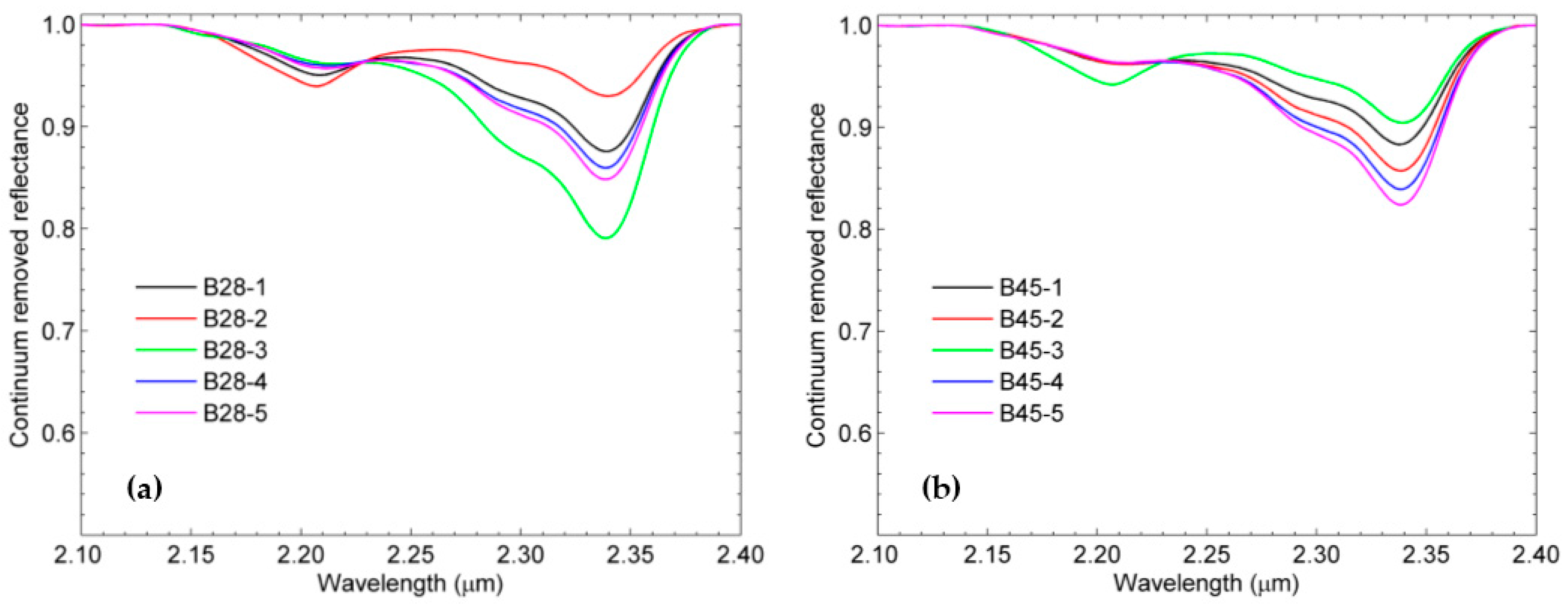 Continuum removed spectra of dark gray limestone samples: (a) sample B28; and (b) sample B45 derived from five ASD spot measurements on the rock sample surfaces in the SWIR wavelength region. The spectral curves exhibit variations of depths of absorption features at ~2.20 µm and ~2.34 µm corresponding to changes in mineral contents on the rock surfaces.
