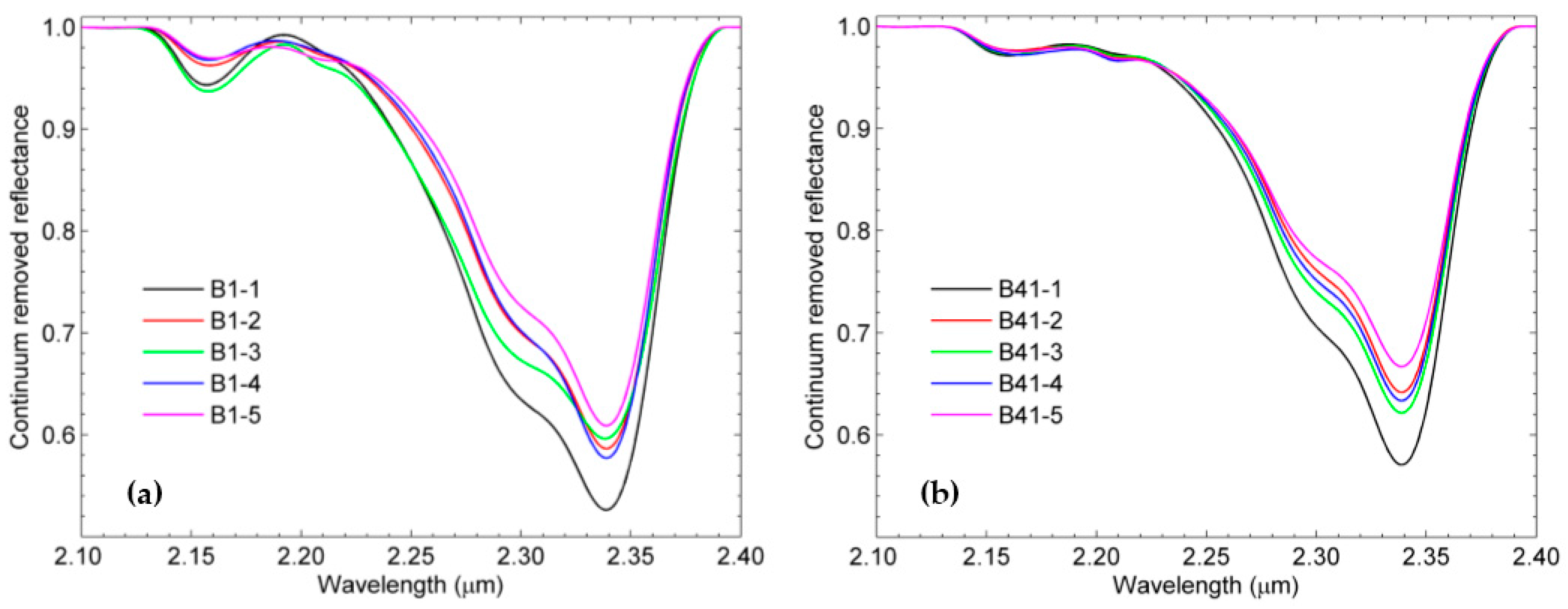 Figure 4 shows the SWIR continuum removed reflectance spectra of the light gray limestone samples (samples B1 and B41) derived from the five ASD spot measurements on the rock surfaces. The spectra exhibit strong and weak carbonate absorption features at ~2.34 µm and ~2.16 µm, respectively, and a subtle Al-OH absorption feature centered at ~2.20 µm. These carbonate features and spectral shapes are attributed to the relatively pure calcite in the rock samples. It can be seen obviously from Figure 3 and Figure 4 that the depth of carbonate absorption feature at ~2.34 µm in the light gray limestone samples (samples B1 and B41) is deeper than that in dark gray limestone samples (samples B28 and B45) and vice versa for the depth of Al-OH absorption feature at ~2.20 µm. This indicates that the light gray limestone samples contain more calcium carbonate mineral (calcite) than the dark gray limestone samples; moreover, the relative abundance of clay and other phyllosilicate minerals content is higher in the dark gray limestone samples than in the light gray limestone samples.