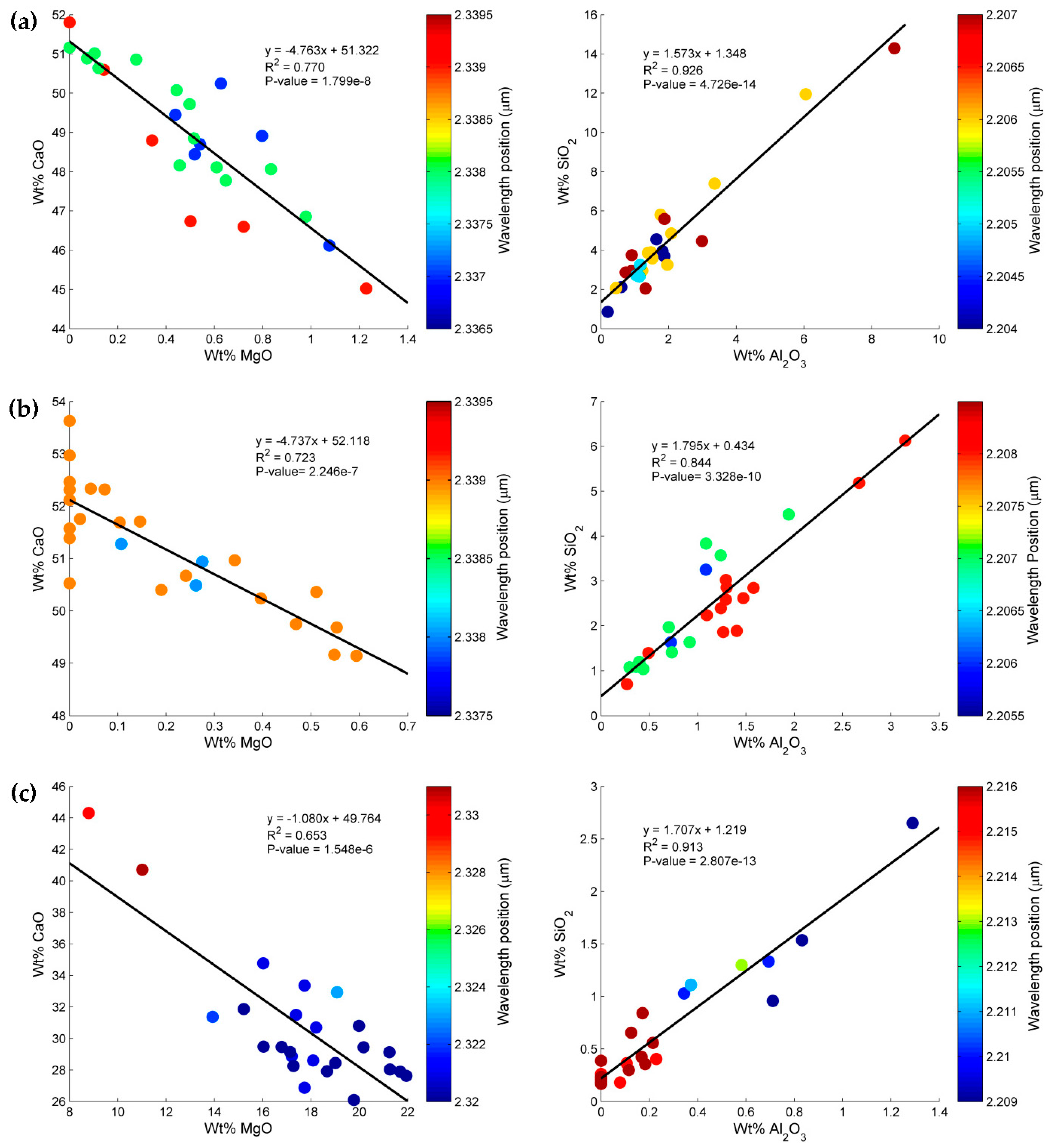 Figure 7 shows the correlation between the CaO and MgO (left) and SiO2 and Al2O3 (right) contents in limestone samples, with the color-coded wavelength position of carbonate and Al-OH absorption features. These analyses reveal that the proportions of these mineral chemistries in carbonate and phyllosilicate minerals are linearly related. The wavelength positions of mineral chemistries vary slightly with their compositions (Figure 7). For the dark gray and light gray limestone samples, the position of carbonate feature is approximately in the wavelength range of 2.337–2.339 µm (Figure 7a,b). The wavelength position is typical of calcium carbonate or calcite [39,41,45,46,47,48,49], which is the dominant mineral in the rock samples. Nevertheless, the wavelength position of carbonate feature of the dolomitic limestone samples in the SWIR region is centered at 2.320–2.330 µm (Figure 7c), which is distinctive of dolomite [39,41,45,46,47,48,49], with a wt % MgO content of approximately 9%–22%. This indicates a larger dolomite or magnesium carbonate mineral content in the rock samples.
