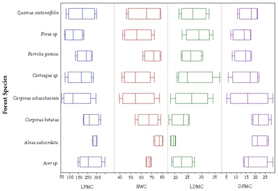 - Leghari, S.K.; Zaidi, M.A.; Sarangzai, A.M. Seasonal variation in leaf relative water, dry matter and live fine fuel moisture contents in some common plant species of Quetta, Balochistan. FUUAST J. Biol. 2013, 3, 73–76. [Google Scholar]