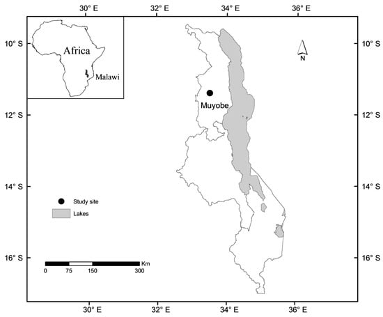 The study was conducted in Muyobe community forest reserve (11°35′S, 33°65′E, 1169–1413 m above sea level), located in Mpherembe traditional authority in Mzimba district in the northern region of Malawi (Figure 2). This forest reserve was established in 2000 to save it from rampant deforestation happening in and around the area due to tobacco farming. The forest reserve is now managed through a committee whose members are representatives from all villages surrounding the forest. The forest reserve is 486 ha, which is a common size for many small- to medium-sized forest reserves in Malawi. Ferrosols are the dominant soil type in the study area []. For the period 1975–2005, the mean annual rainfall was 889 ± 146 mm and the mean annual daily minimum and maximum temperatures were 15 ± 1.6 °C and 26 ± 0.6 °C, respectively (the nearest weather station is located about 69 km south of the study area). The rain season lasts from December to April. The study area comprises miombo woodlands with Julbernadia globiflora, Diplorhychus condylocarpon and Combretum zeyheri as dominant species.