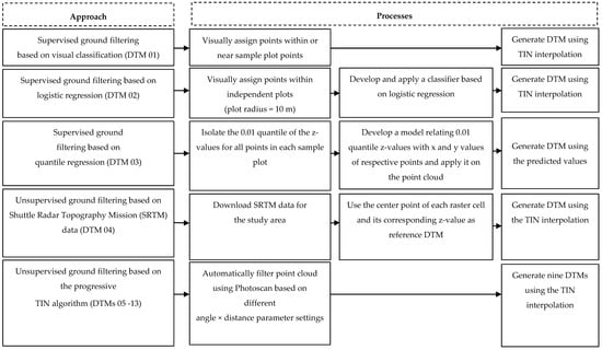 Five different approaches, with a total of 13 variants for generating DTMs, were tested (Figure 3): (a) supervised ground filtering based on visual classification; (b) supervised ground filtering based on logistic regression; (c) supervised ground filtering based on quantile regression; (d) unsupervised ground filtering based on shuttle radar topography mission (SRTM); and (e) unsupervised ground filtering based on the progressive triangular irregular network (TIN) algorithm.