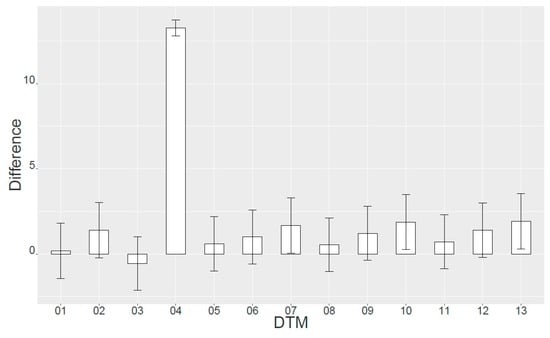 Mean height differences (m) between measured GPS (reference values) and predicted heights for the different DTM generation methods with standard errors: 01, DTM using supervised ground filtering based on visual classification; 02, DTM using supervised ground filtering based on logistic regression; 03, DTM using supervised ground filtering based on quantile regression; 04, DTM using unsupervised ground filtering based on shuttle radar topography mission (SRTM); and 05–13, DTMs using unsupervised ground filtering based on a grid search approach for optimal parameter settings in Agisoft Photoscan Professional software (See Section 2.4. for details).