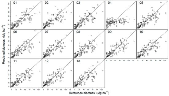 Ground reference versus predicted biomass for different DTMs: 01, DTM using supervised ground filtering based on visual classification; 02, DTM using supervised ground filtering based on logistic regression; 03, DTM using supervised ground filtering based on quantile regression; 04, DTM using unsupervised ground filtering based on shuttle radar topography mission (SRTM); and 05–13, DTMs using unsupervised ground filtering based on a grid search approach for optimal parameter settings in Agisoft Photoscan Professional software (see Section 2.4. for details).