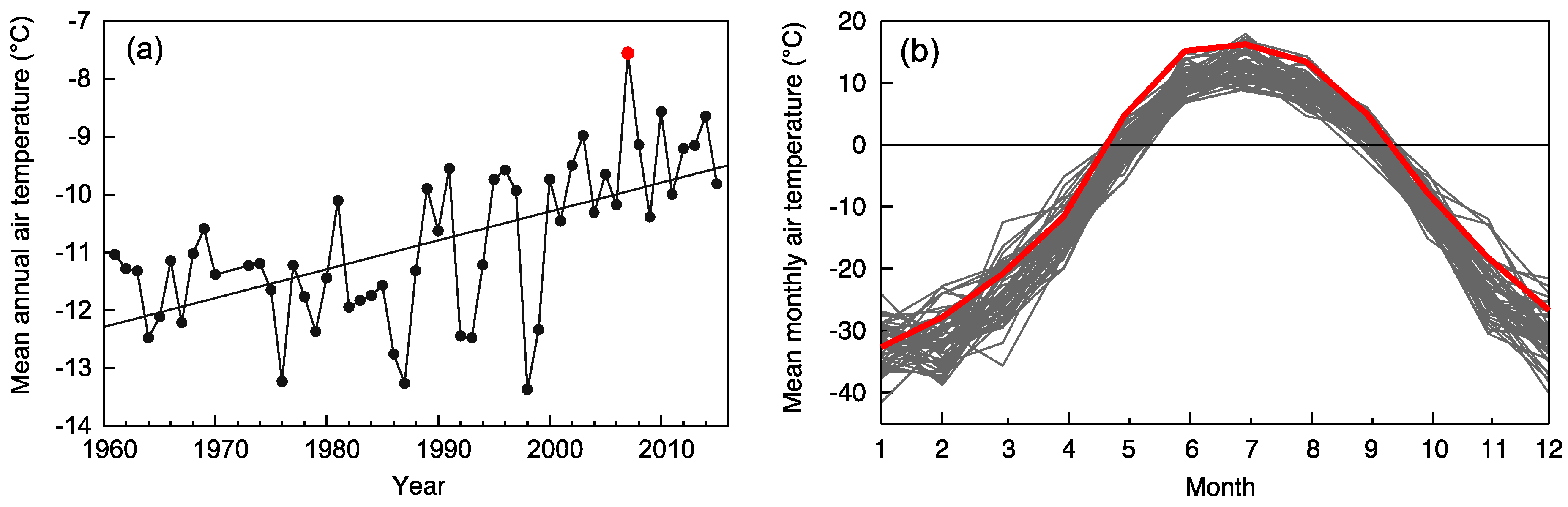 Figure 2. Time series of mean (a) annual and (b) monthly air temperatures observed at the meteorological station in Chersky for the period 1960–2015. The red line indicates the air temperatures in 2007, and the gray lines show the air temperatures for the other years.