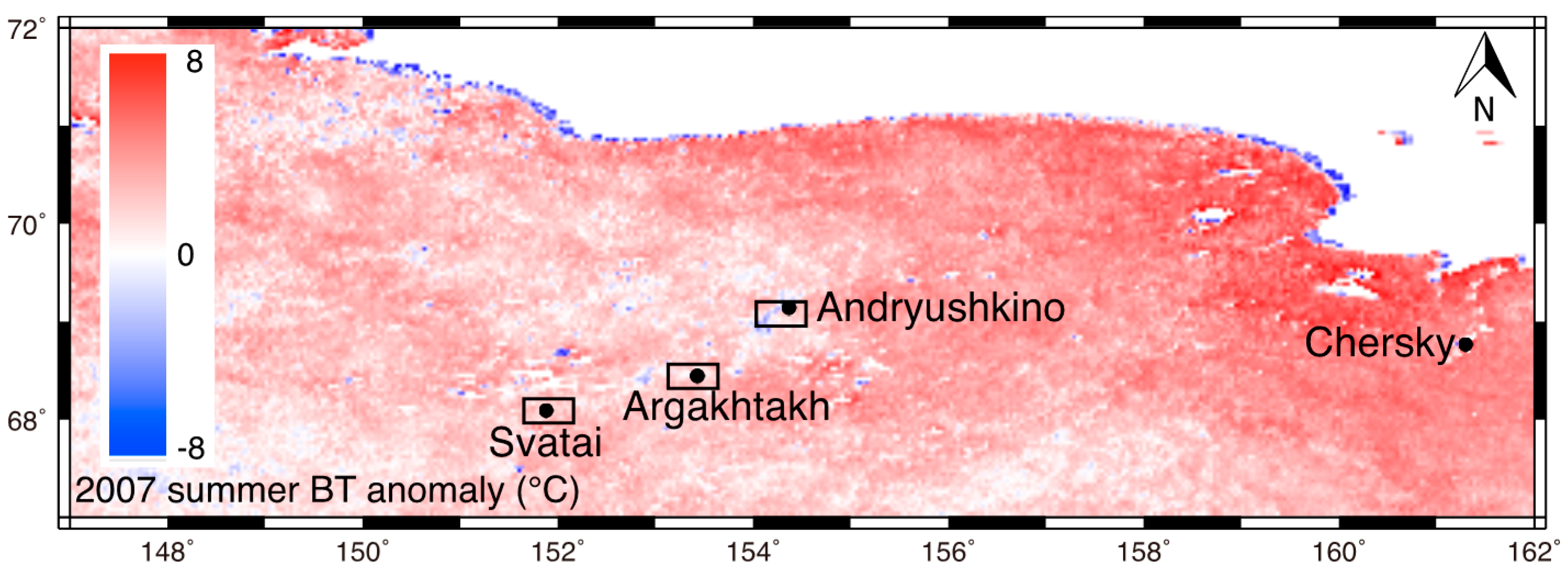 Figure 4 shows the anomaly map of summer AVHRR BT in 2007 when the highest mean annual air temperature was observed in Chersky (Figure 2a) with respect to the 1982–2015 baseline. While the anomaly of the summer AVHRR BT in 2007 was positive over a wide area, small patches with large negative value were frequently observed near riverbanks, lakeshores and seashores where land cover transitioned from land to a water body due to the formation, expansion and drainage of thermokarst lake and/or the increase in water level by heavy precipitation and melting of frozen ground.