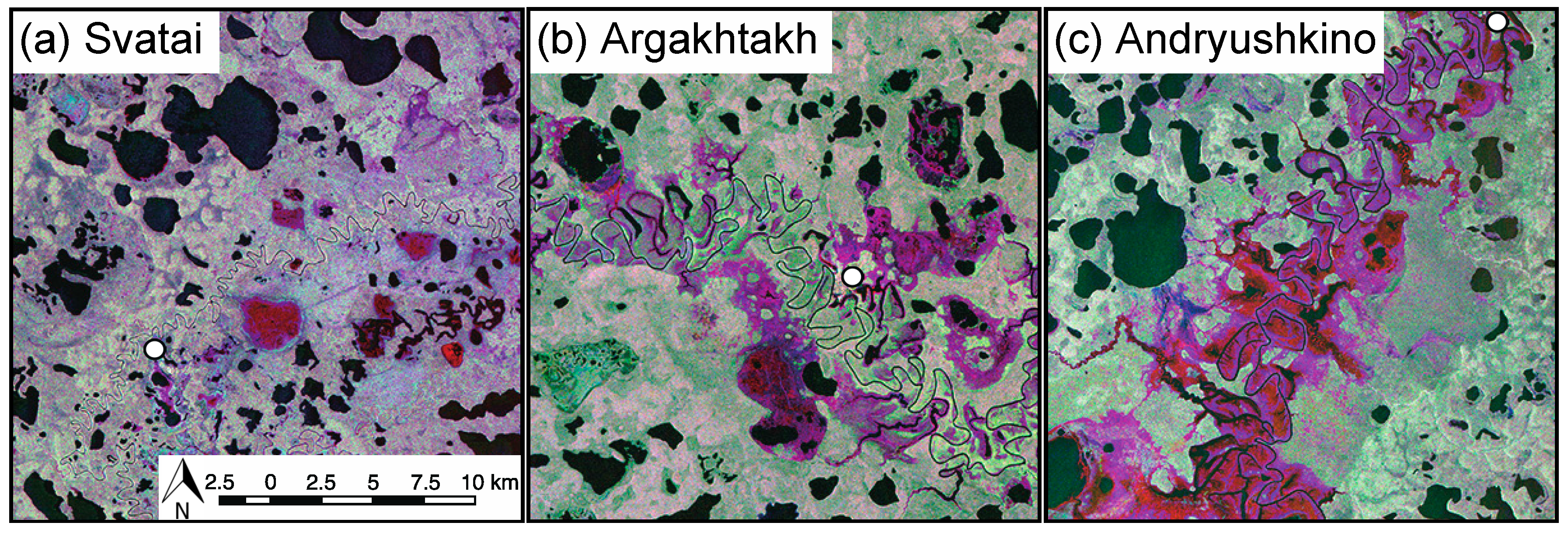 The Alazeya River flows 1590 km northeast and then north before emptying into the Arctic Ocean. It is frozen from November to May and the discharge is mainly driven by snow melt, which peaks in May/June. To assess the potentially different effects of thermokarst dynamics in the region, three large villages, Svatai (68.06°N, 151.80°E, 32 m above sea level, asl), Argakhtakh (68.47°N, 153.36°E, 22 m asl) and Andryushkino (69.17°N, 154.50°E, 10 m asl) on the upper, middle and lower reaches of the Alazeya River, respectively, were considered in this study. Although the horizontal distance between Svatai in the upper river reaches and Andryushkino in the lower river reaches is approximately 170 km, the vertical distance is only 22 m.