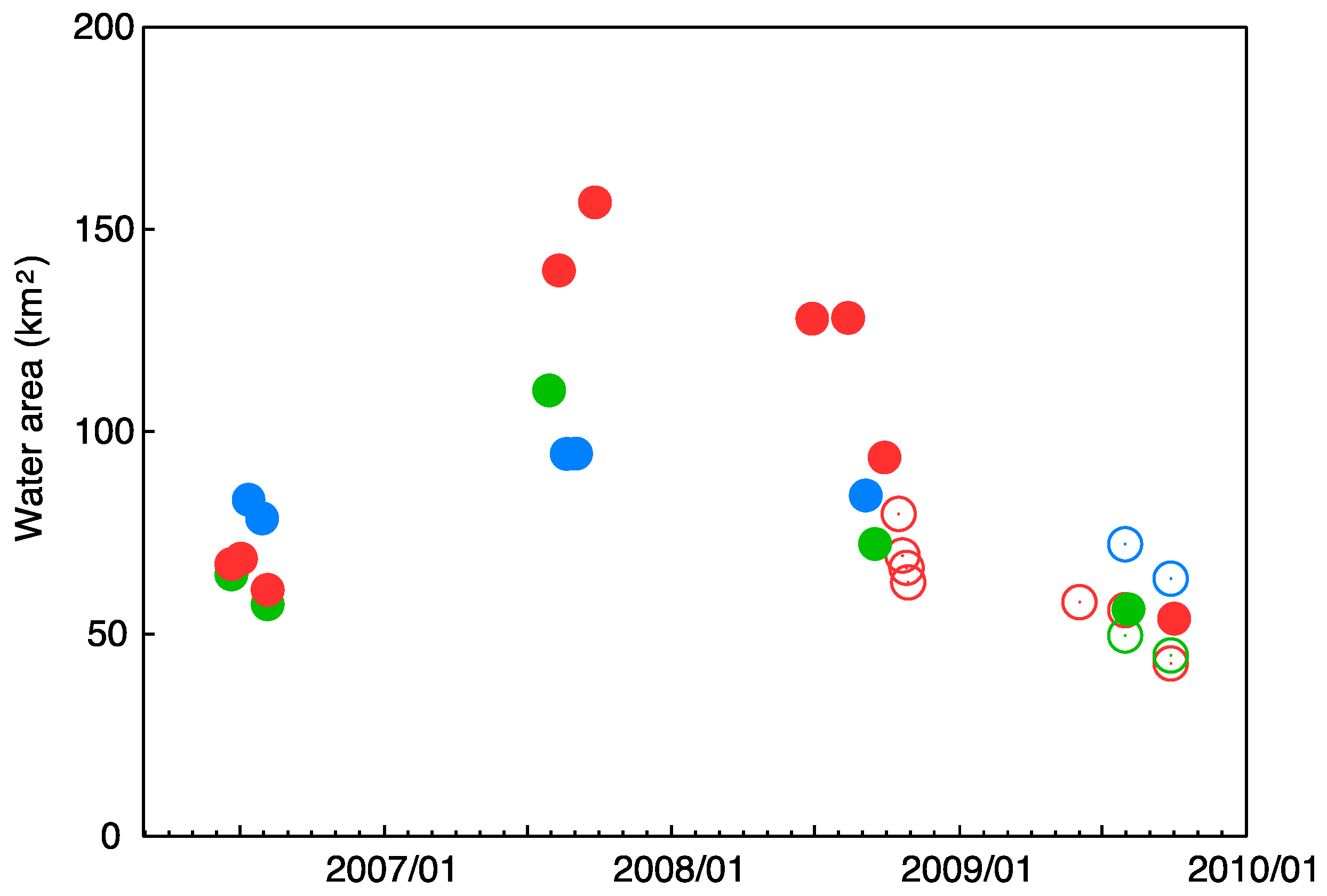 Figure 6. Water area detected by PALSAR data during the summer season from 2006 to 2009 in the 20 km × 20 km area shown in Figure 5. Blue, green and red dots show the villages of Svatai, Argahtah and Andryushkino, respectively. Closed and open circles show fine and ScanSAR modes of PALSAR, respectively.