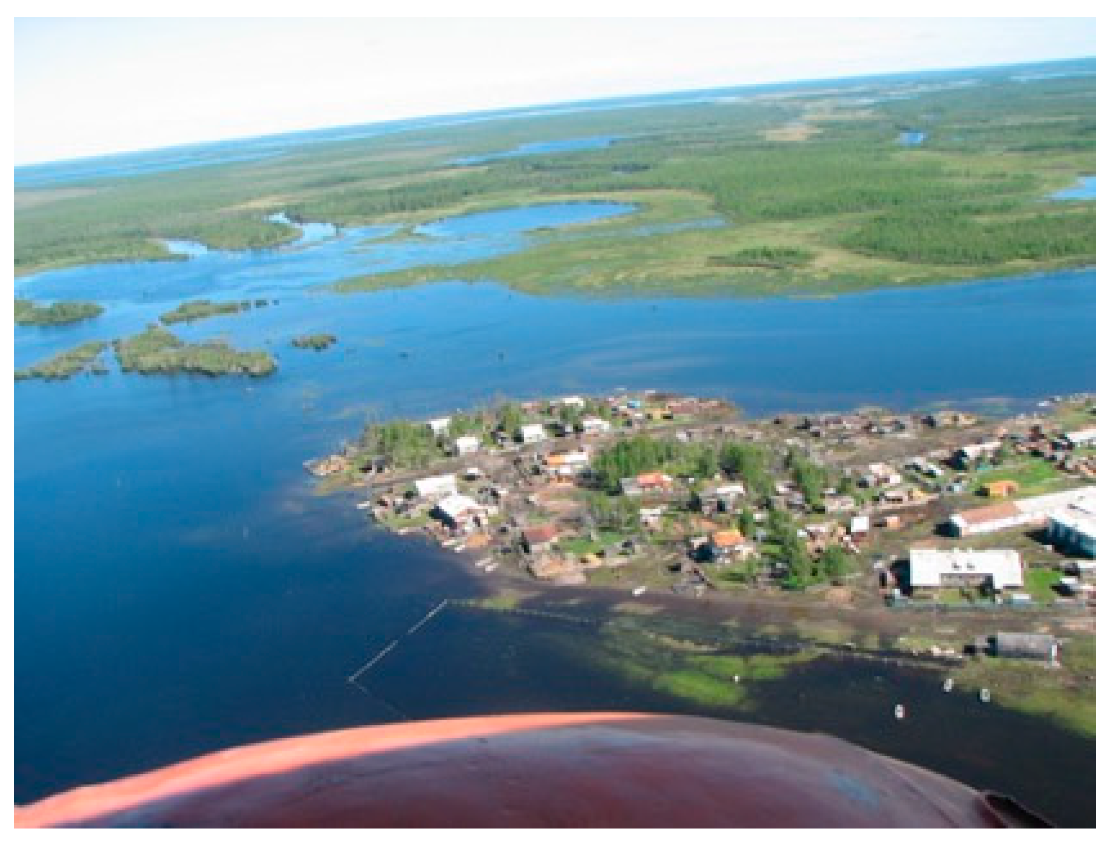 Arctic regions are undergoing rapid warming due to the increase in greenhouse gas emissions from human activities [1]. The warming in the Arctic has altered the energy balance between land surface and atmosphere, resulting in widespread melting of snow and ice [2,3], as well as an increase in the frequency of cumulonimbus cloud formation and thunderstorm activity [4,5]. These changes have increased river discharge in the region [6], resulting in an increased probability of occurrence of extreme hydrological events, such as lake drainage and flood [7]. In fact, the economic costs associated with floods have continued to increase in recent decades in Siberia [8]. Moreover, most climate change scenarios indicate that more extreme hydrological events are expected in the future [1]. Consequently, assessing how climate change can increase the incidence of extreme hydrological events is becoming very important. However, the magnitude and type of such events depends on a variety of local factors, including climate (air temperature, precipitation, snow depth and snowfall duration) and geomorphology (basin size, location and topography). Without a knowledge of the underlying mechanisms and complex sequence of hydrological processes, risk mitigation strategies are not reliable.