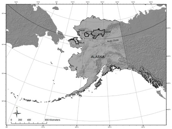 Study location. The boundaries of the National Parks and Preserves are indicated, including from East to West, Gates of the Arctic (GAAR), Kobuk Valley (KOVA), and Cape Krusenstern (CAKR), all in the Arctic Circle, and Bering Land Bridge (BELA) which straddles the boundary of the Arctic Circle.