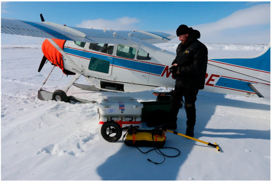 The instrument used for all examples described in this paper was a 250 MHz center frequency (band width 125–375 MHz) Noggin System by Sensors and Software Inc. Instrument, and survey parameters are listed in Table 2. All sites used as examples in this paper required access by small aircraft, including float planes, ski planes and helicopters (Figure 3). This, in turn, required light equipment loads, which in some cases had to be backpacked some distance to and from a suitable landing site. This situation made options such as push-cart GPR setups and multiple antenna arrays less desirable. For this reason, a mid-range antenna frequency (i.e., one that can be trusted for a balance of both reasonable resolution and penetration) and small sled deployment setup were chosen for the work (Figure 3).