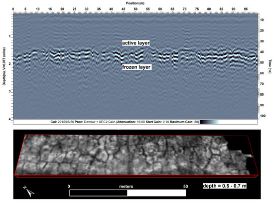 - Seasonal changes in the depth and character of the active layer influence the results of GPR surveys. In areas with substantial soil moisture, it may make sense to survey when active layer thickness reaches its seasonal maximum. The ground may be waterlogged, however, and penetration can be ensured by using a moderate antenna frequency as used in the examples shown here. Shortened wavelengths due to the high water content may allow excellent spatial and temporal resolution even with lower antenna frequencies.