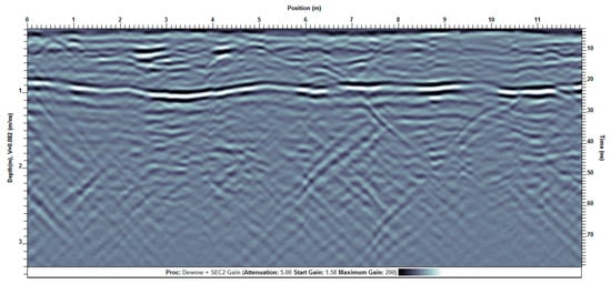 Profile processed as a two-velocity medium. The average velocities of both the frozen and active layer from the same profile shown in Figure 7 were used to produce the above profile with accurate depth estimates for both layers. Depths in the frozen layer are tens of centimeters more than estimated with the active layer velocity alone. The profile above has also migrated using the velocity of the frozen layer. Note that the majority of diffraction tails have been reduced or eliminated when compared to the previous figure.