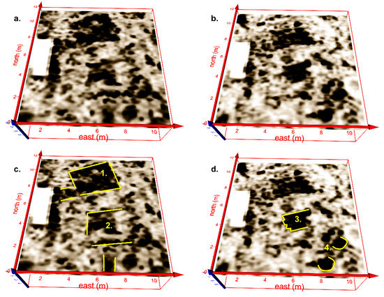 (a) Portion of a Birnirk house complex in the active layer (upper meter) with layout and dimensions consistent with nearby excavated examples. The darker colors indicate higher amplitude reflections from buried wood, bone and other material as seen in the nearby excavation; (b) Portion of a Birnirk house complex in the frozen layer (extending below one meter) with layout and dimensions consistent with nearby excavated examples. This is a deeper portion of the same house complex shown in (a); (c) Annotated interpretations 1 and 2 indicated the proposed outline of structures interred from (a), along with likely tunnel locations. The orientation and scale of these features are comparable to the nearby excavation (Figure 10 and Figure 11), and the excavated and unexcavated structures are likely connected; (d) Annotations indicate a likely cluster of timbers, three, and external storage pits, four. Other discrete anomalies scattered throughout the survey area are likely caused by debris such as wood and whale bone external to the structures. This is also consistent with the nearby excavation.