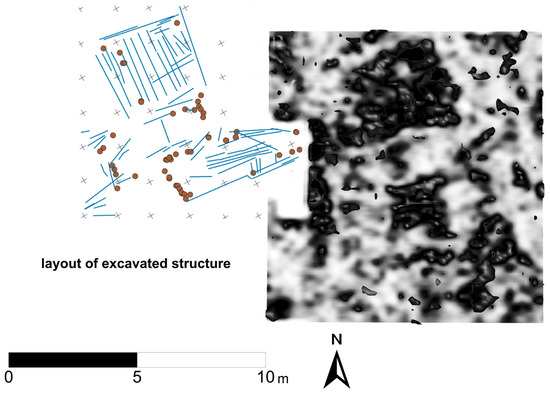 The relationship of the excavated structure to the unexcavated features detected with GPR. The comparative scale and alignment of the known and inferred features is obvious. The GPR image (right) is a 3-D iso-surface showing high amplitude anomalies spanning a depth of ca. 0.5–1.2 m.