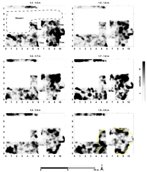 GPR survey area around House I depression. The outline of a deeper house appeared in the GPR survey from a depth of 1.4–2.0 m, shown above as a series of depth-slices at 0.1 m increments. The projected perimeter of the deeper house is indicated in yellow in the final slice. GPR coverage was limited by the presence of trees at this forested site.