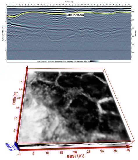 Just beneath the shallow lake bottom, the GPR data reveal patterns characteristic of ice wedge polygons. The interface of the silty lake bottom, upon which the mammoth bones rest is indicated in the profile (top). A deeper interface seen in the profiles may be due to a textural transition in the substrate, from finer-grain sediment to coarse gravel.