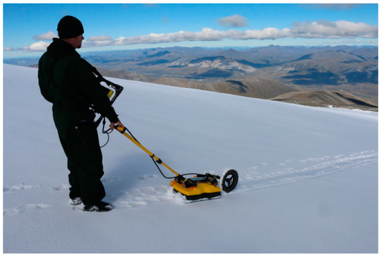 In 2016 our field team examined a low sloping ice field in GAAR (see Figure 1), at an elevation of ca. 2150 m above mean sea level (AMSL), to test the feasibility of using GPR in ice and snow patch investigation. This particular area was selected as one that would be accessible by both caribou and people, and therefore have reasonable archaeological potential. This alpine ice-field was accessed by helicopter, and nearly 1 km of GPR profiles were collected (Figure 17). All profiles clearly showed the type of reflections from internal bedding and diffractions from embedded targets that would be crucial for archaeological and paleo-environmental investigations of such features (Figure 18 and Figure 19). Our findings show that GPR, when paired with coring and surface investigations at the melt-zone of such features, could prove useful in identifying areas where archaeological deposits are likely to occur and may be subject to future loss due to melting. Though only in the trial stage, we believe that GPR could offer a major contribution to research and resource management for these threatened sites. The high-resolution measurement of the ice patch depth and cross-section can provide a useful means to monitor changing conditions of ice patches and track melting, though it should be noted that ice thickness and volume estimation can be subject to error [53]. Although layers of caribou dung—typically a key indicator of the presence of cultural materials—were not present in this ice patch, GPR methods would be well suited to detecting dung layers and mapping or quantifying their frequency, depth, and areal extent, which could help to identify the most productive ice patches for regular monitoring. The example shown here demonstrates the feasibility of deploying GPR in such cases.