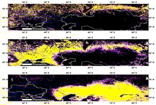 Our study region spans the major grain producing areas of Ukraine, southern Russia, and northern Kazakhstan. According to MODIS Land Cover Type 1 Percentage Product for the IGBP scheme (2003–2010), the dominant classes in the study region are Grassland (IGBP class 10 at 34%), Cropland (IGBP class 12 at 27%), Crop–Natural Vegetation Mosaic (IGBP class 14 at 14%), and Mixed Forest (IGBP class 5 at 11%). The overall land cover classification accuracy for this product is about 75%, but the range in class-specific accuracies is large [61]. In order to select specific AMSR-E study pixels with a high and stable percentage of cropland, we conducted a temporal stability analysis for each of the three dominant land cover classes over the 8 years study period by first calculating the maximum, minimum, and mean land cover percentage over the study period and then displaying the maximum, mean, and range in the red, green, and blue color planes, respectively [50]. Yellow (high maximum and high mean and low range) identifies land cover that is stable over the study period (Table 2, Figure 1). Expanses of yellow in Figure 1 indicate where Crop–Natural Vegetation Mosaic (Figure 1a), croplands (Figure 1b), and grasslands (Figure 1c) continue to be the dominant land cover during the study period.