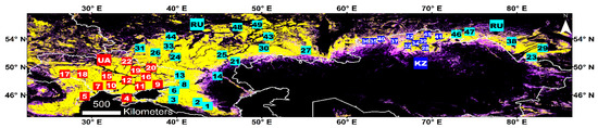 Study region cropland stability map superimposed with the 49 specific AMSR-E pixels selected for this study. The AMSR-E pixels are numbered by latitude starting from the most southern site. Name for each site is their closest large settlement (cf. Table 3). Red squares are in Ukraine, cyan squares in Russia, and blue squares in Kazakhstan.