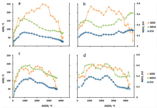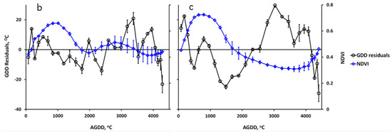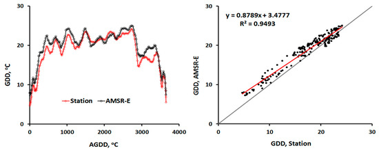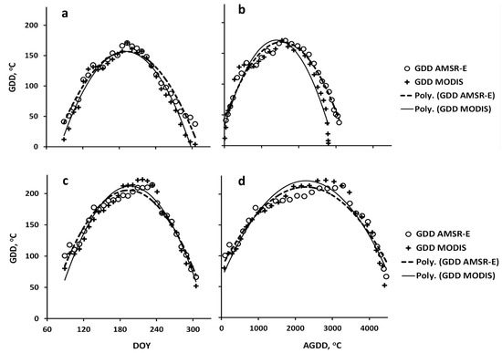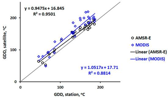 During summer in the Northern hemisphere, the maximum and minimum air temperatures typically occur late afternoon and predawn, respectively, while data from AMSR-E and MODIS Aqua (N.B.: AMSR-E is onboard Aqua satellite) are recorded twice daily (ascending—daytime, ~13:30, and descending—nighttime, ~01:30 overpasses), and that of Terra is on ~22:30 and ~10:30, respectively. We use MODIS Aqua and Terra average LST for GDD from MODIS. As a consequence, the satellite AGDD may be biased when compared with meteorological measurements, which in turn may limit the modeling of quantitative vegetation specific AGDD that drive phenophase transitions.