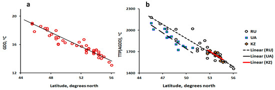 Thermal climates as a function of latitude revealed by: (a) average daily GDD; and (b) Thermal Time to Peak (TTPGDD). Latitudes were the geographic centers of AMSR-E pixels. All 49 study sites are displayed in both figures. In (b), hollow circles = Russia, orange diamonds = Kazakhstan, and cyan crosses on blue background = Ukraine. Both panels show a general decrease in (a) GDD or (b) TTP as latitude increases from 44° to 56°N. The uppermost two hollow circles are the northernmost study sites (site 49, Kazan’, Russia and site 48, Cheboksary, Russia), while the lowermost two hollow circles are the southernmost study sites (site 1, Cherkessk, Russia and 2, Stavropol, Russia).
