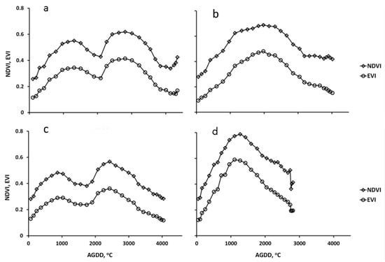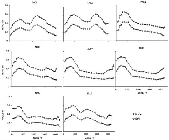 Over the eight years of study, NDVI and EVI displayed similar patterns, but with clear seasonal and interannual variation. In the same location, some years displayed growing season bimodality while others exhibited unimodality. Variation in the timing of peak VI was higher in some locations than others. For example, Simferopol, located in Crimea, had three bimodal years (2003, 2004, and 2010) and five unimodal years (2005–2009) (Figure 10). Variation was evident within bimodal growing seasons: in 2003 the second peak was higher (peak NDVI of 0.57 versus 0.48); in 2004 peaks were wider apart in time (difference between first and second peak AGDD of 1900 °C in 2004 versus 1550 °C in 2003); and in 2010 the second peak was much smaller (peak NDVI of 0.51 versus 0.59). Years with a unimodal peak generally had peaks that were larger compared to the bimodal peaks (peak NDVI of >0.63 versus <0.63). In 2007 and 2008 the peaks were earlier; while in 2003, 2009, and 2010 the peak heights were lower. Moreover, since Simferopol is a southern site, the growing season can start before DOY 89, but with interannual variation due to weather. The effect on the VI curves in Figure 10 is clear: the early season green-up pattern in 2003–2005 has initial NDVI (EVI) at or below 0.4 (0.2). In contrast, initial VIs in 2006–2010 are well above 0.4 and 0.2 for the NDVI and EVI, respectively.