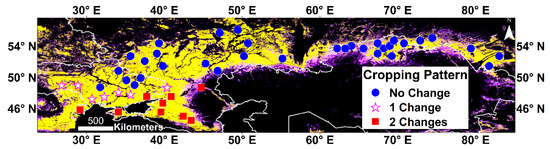 Sites adjacent to land cover transition zones experience higher temporal variation in cropland cover (sites closer to the unstable peripheral areas with the magenta color in Figure 2 (see also Table 2)). For example, Saratov 1 in Russia (site 21) had the largest grassland encroachment with 69% and 31% mean cropland and grassland cover, respectively, over the eight years and, thus, had the largest cropland cover range (28%). Omsk 1 in Russia (site 46), and Kostanay 2 in Kazakhstan (site 36) are other examples of this phenomenon.