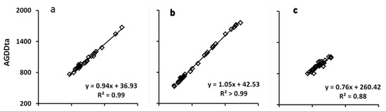 To characterize the seasonal progression of thermal time, we fitted the GDDs as a convex quadratic (CxQ) function of AGDD. The CxQ model have been successfully applied in temperate herbaceous vegetation and boreal ecosystems [21,47,65].