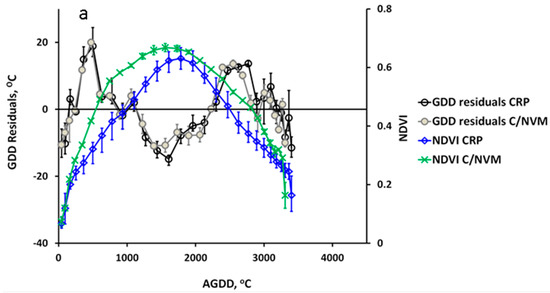 Winter grains grown in the region—wheat, rye, and barley—are planted and emerge in the fall before becoming dormant over the winter. Resuming growth in the early spring when the air and soil temperatures warm, they produce a rapid increase in VI earlier in the year. Winter grains’ ripening and senescence phase occurs in late spring through early summer, expressed by the rapid VI decrease by mid-summer. A second increase in VI is due to late spring planting and emergence with the cycle peaking late summer with early fall harvest. For areas that grow winter grains, another smaller VIs peak appeared in mid-fall (Figure 9a), corresponding to the emergence and growth of the next year’s crop before winter dormancy.
