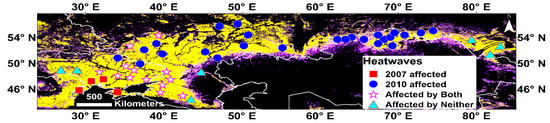To identify our specific cropland study areas, we used two datasets: (1) the International Geosphere Biosphere Programme (IGBP) land cover scheme in the MODIS land cover product at a spatial resolution of 0.05° (MCD12C1; [59]); and (2) the USDA Foreign Agriculture Service (FAS) crop layers by oblast (for Russia: [62], for Kazakhstan: [63], for Ukraine: [64]). Details on the selection process of the study sites are presented in Section 2.2.