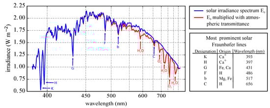 The solar spectrum with and without atmospheric absorption projected to APEX’s spectral resolution in the VNIR channel. The sharp lines in the spectra are mainly caused by solar Fraunhofer lines below 550 nm and by atmospheric and absorption above 550 nm. The most prominent Fraunhofer lines are marked by their designators [17].