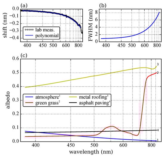 (a) Wavelength shift caused by a 15-hPa pressure change in the APEX spectrometer. The shift-pressure sensitivity was measured in the laboratory. (b) Nominal full-width at half maximum (FWHM) of the APEX slit function after fitting a curve to the laboratory measurements. (c) Spectral albedo from the ASTER spectral library [29] and estimated atmospheric albedo due to scattering simulated for a nadir-viewing instrument at a 5000-m altitude over a black surface.