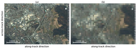 True color composite of the APEX test cube at (a) full spatial resolution and (b) binned to 25 × 50 pixels. The area size is about 3070 × 4860 m, and binned pixels are about 122 × 97 m. The numbers mark the 25 lines in the along-track direction.