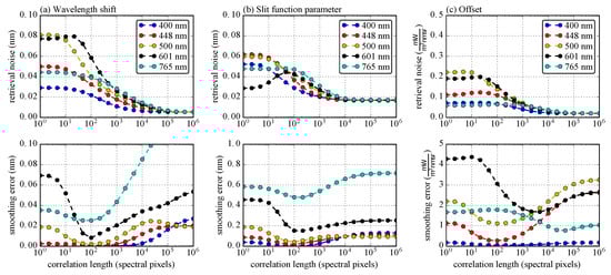 Retrieval noise and smoothing error for retrieval of: (a) wavelength shift; (b) slit function parameter (FWHM); and (c) radiance offset with different correlation lengths in the a priori covariance matrix. The measurement uncertainty was 0.2 mW·nm·m·sr.