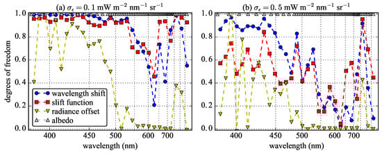 The C-splines cause a parametrization error that depends on the number and location of knots, as well as the parametrized curve. The knot spacing for wavelength shift and FWHM was chosen such that the spline can parametrize expected shifts and FWHM without any parametrization error. The offset spline fits the part of the error term that varies slowly with wavelength, and thus, its parametrization error is already described by the instrument error. For the albedo spline, knot spacing was chosen as a compromise between parametrization error and the number of knots using reference surface reflectances. For the three different surface reflectances, the parametrization errors were estimated between 0.038 and 0.174 mW·m·nm·sr.