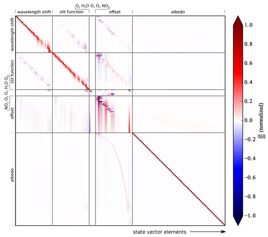 Some of the uncertainties of the a priori state vector elements are assumed to be correlated, which further regularizes the problem and makes the estimation of 165 individual state vector elements possible. Error covariances were considered for wavelength shift, FWHM and offset spline as: