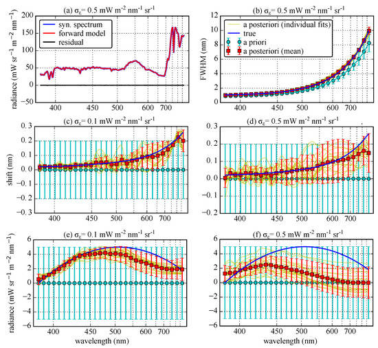 Results of spectral calibration for an ensemble of synthetic spectra over “green grass”. The wavelength shifts were due to a 15-hPa pressure change; the laboratory FWHMs were scaled by 1.2; and the offset term (Equation (1)) was added to the spectra. (a) Mean simulated spectrum and forward model mean and averaged residual; (b) a priori and a posteriori FWHM; (c–f) a priori and a posteriori wavelength shifts and radiance offsets for small and large measurement noise.