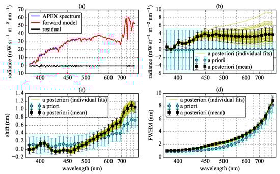 Example of APEX spectral calibration results for fifty spectra in Line 10. (a) Mean measured spectrum and forward model mean and average residual; (b–d) a priori and a posteriori radiance offset, wavelength shift, FWHM.