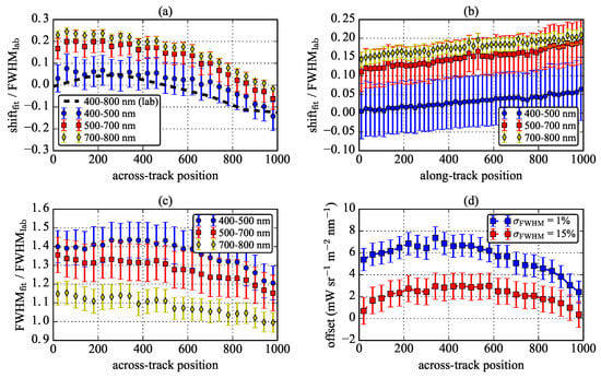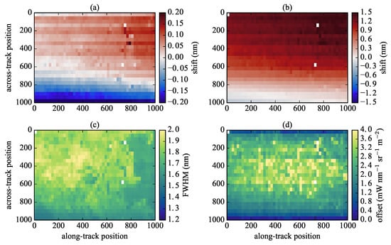 Across- and along-track changes of APEX spectral calibration for the test cube sampled over Zurich. The maps show wavelength shifts in: (a) the visible (410–520 nm); and (b) the near infrared (720–815 nm); (c) shows the FWHM in the along- and across-track direction; and (d) radiance offset for 410–520 nm.