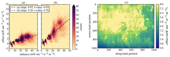 The wavelength-dependent FWHMs are similar to the laboratory calibration, but up to 50% larger, especially between 450 and 600 nm (Figure 8d). They also depend on surface type and are larger over bright surfaces (compare Figure 3 with Figure 9c for 410–520 nm). This behavior is unexpected and unrealistic. The retrieved radiance offsets do not clearly depend on the surface type (Figure 9d), but depend slightly on absolute levels of the measured radiance (Figure 11a). In the across-track direction, the radiance offset has a pronounced drop-off towards the edges of the detector (Figure 10d), although the measured radiance does not change strongly in the across-track direction. The wavelength-dependent radiance offset is retrieved with high accuracy below 450 nm, while it is mainly constant above 500 nm (Figure 8b).