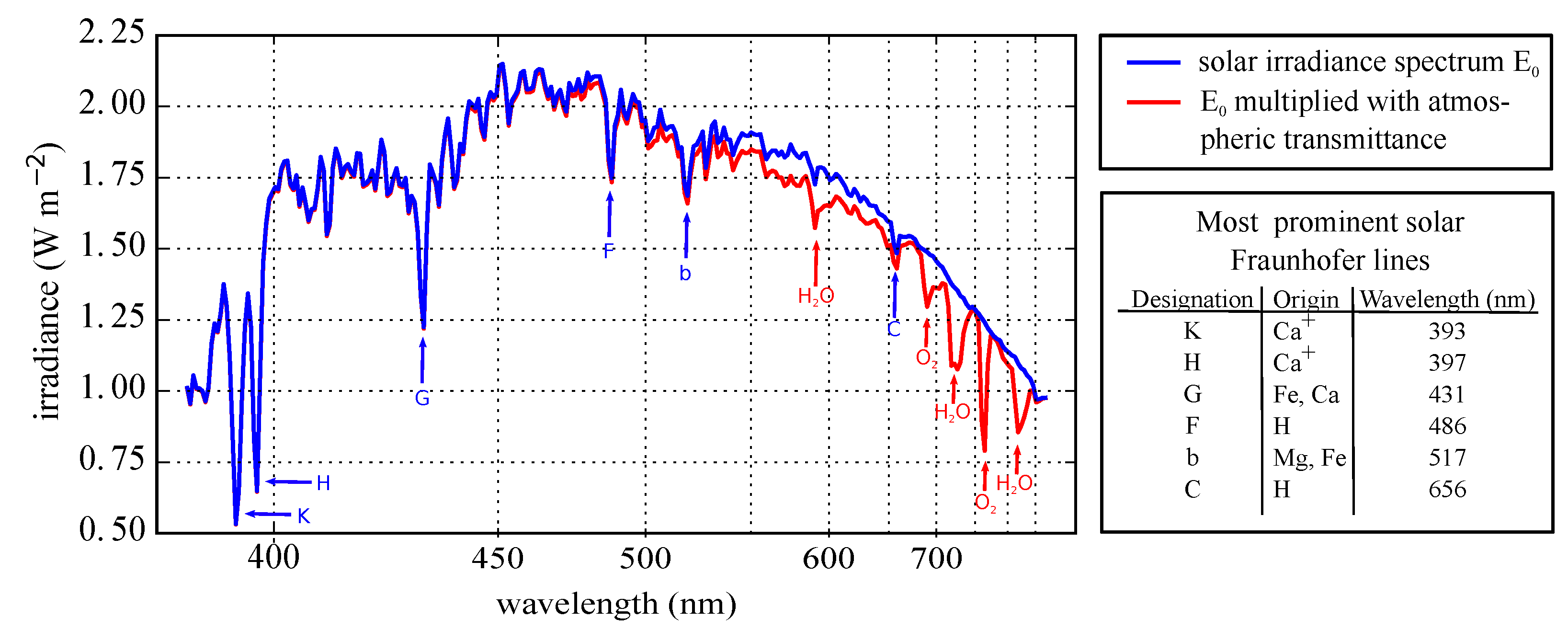 Figure 1. The solar spectrum with and without atmospheric absorption projected to APEX’s spectral resolution in the VNIR channel. The sharp lines in the spectra are mainly caused by solar Fraunhofer lines below 550 nm and by atmospheric O 2 and H 2 O absorption above 550 nm. The most prominent Fraunhofer lines are marked by their designators [17].