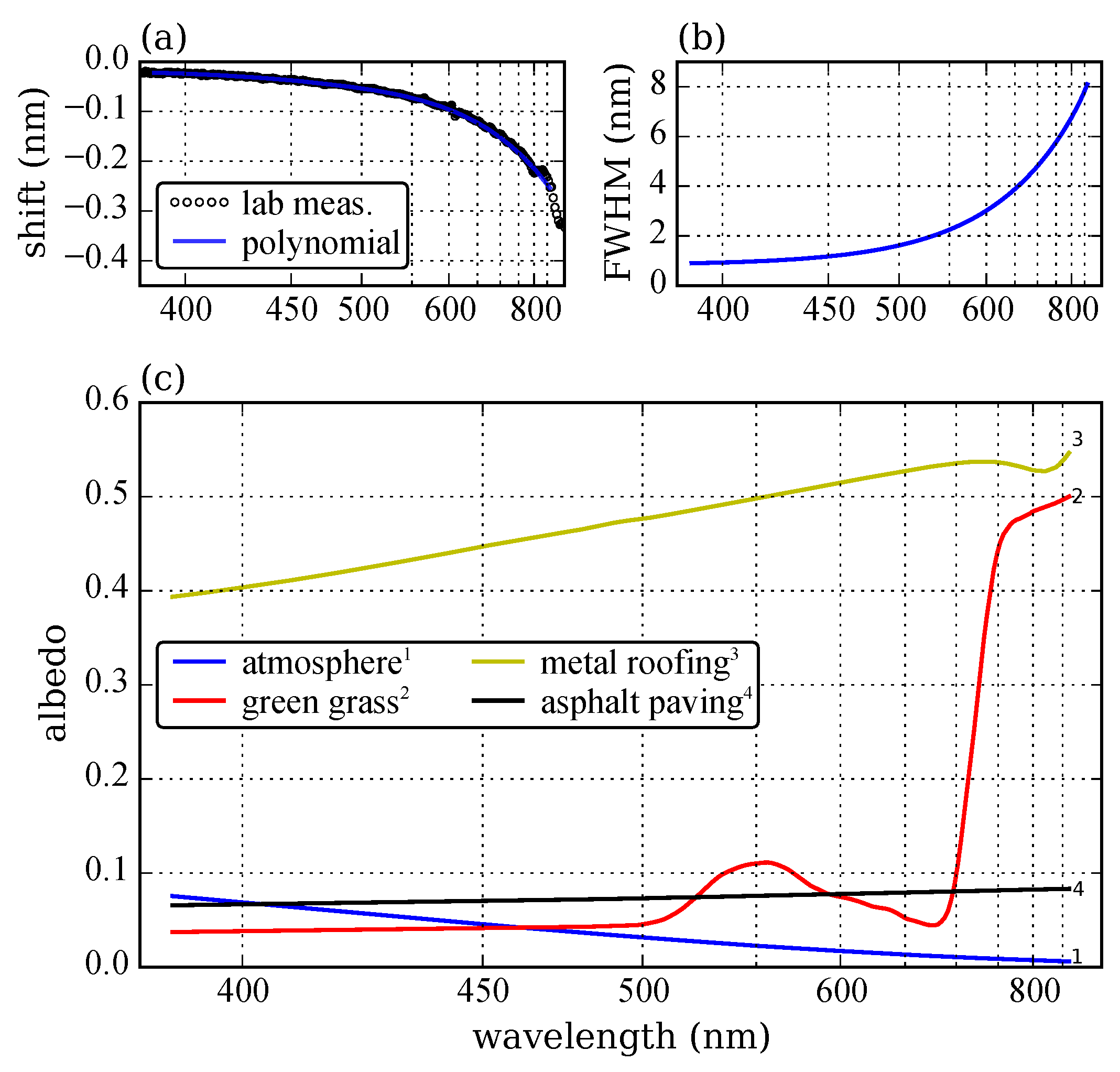 Figure 2. (a) Wavelength shift caused by a 15-hPa pressure change in the APEX spectrometer. The shift-pressure sensitivity was measured in the laboratory. (b) Nominal full-width at half maximum (FWHM) of the APEX slit function after fitting a curve to the laboratory measurements. (c) Spectral albedo from the ASTER spectral library [29] and estimated atmospheric albedo due to scattering simulated for a nadir-viewing instrument at a 5000-m altitude over a black surface.