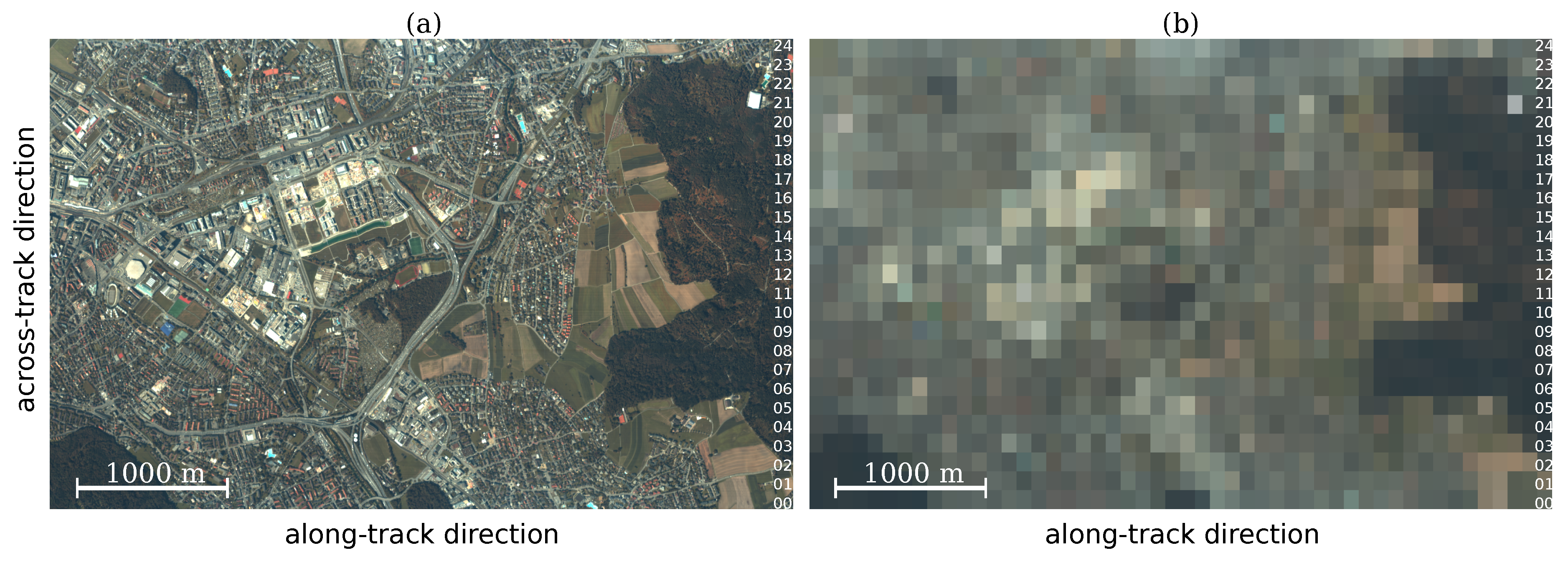 Figure 3. True color composite of the APEX test cube at (a) full spatial resolution and (b) binned to 25 × 50 pixels. The area size is about 3070 × 4860 m 2 , and binned pixels are about 122 × 97 m 2 . The numbers mark the 25 lines in the along-track direction.