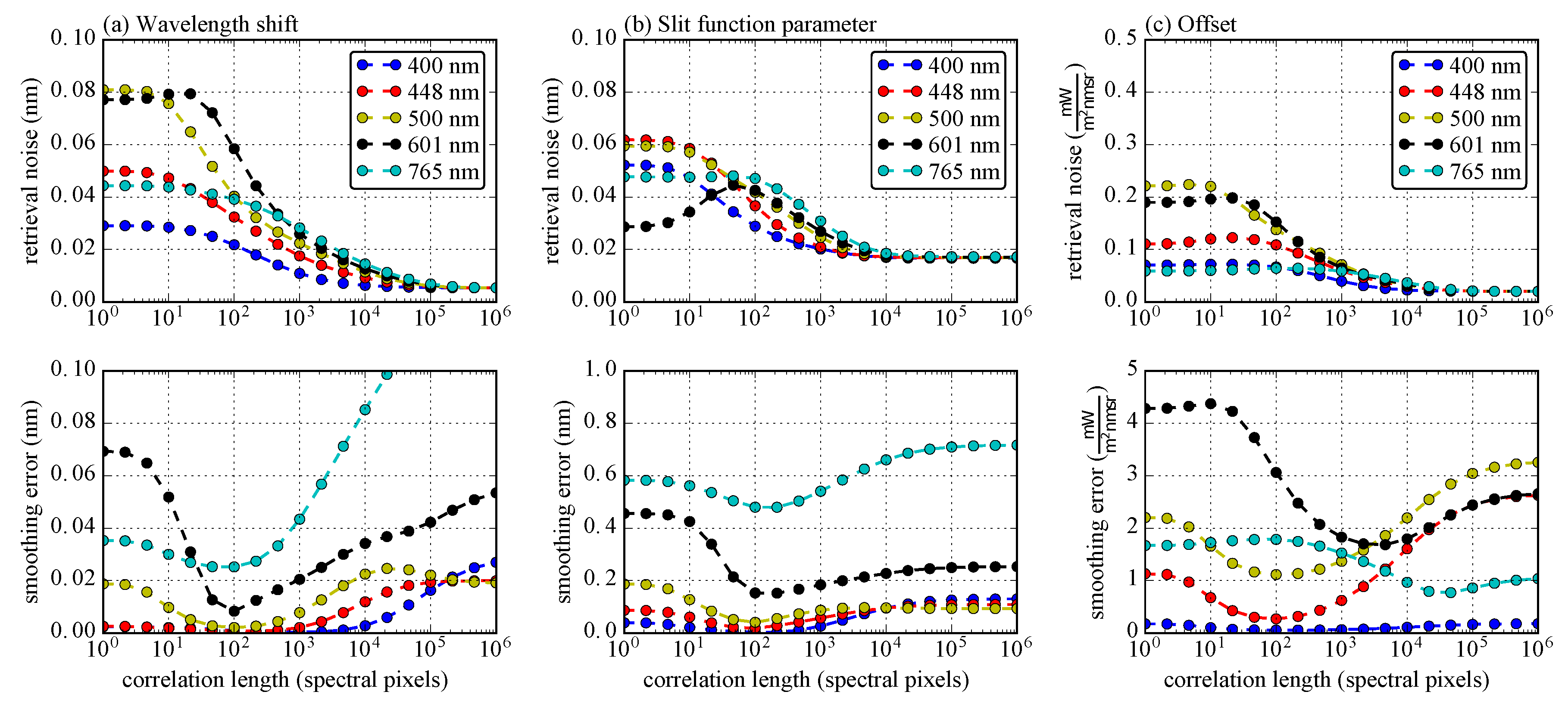 Figure 4. Retrieval noise and smoothing error for retrieval of: (a) wavelength shift; (b) slit function parameter (FWHM); and (c) radiance offset with different correlation lengths in the a priori covariance matrix. The measurement uncertainty was 0.2 mW·nm - 1 ·m - 2 ·sr - 1 .
