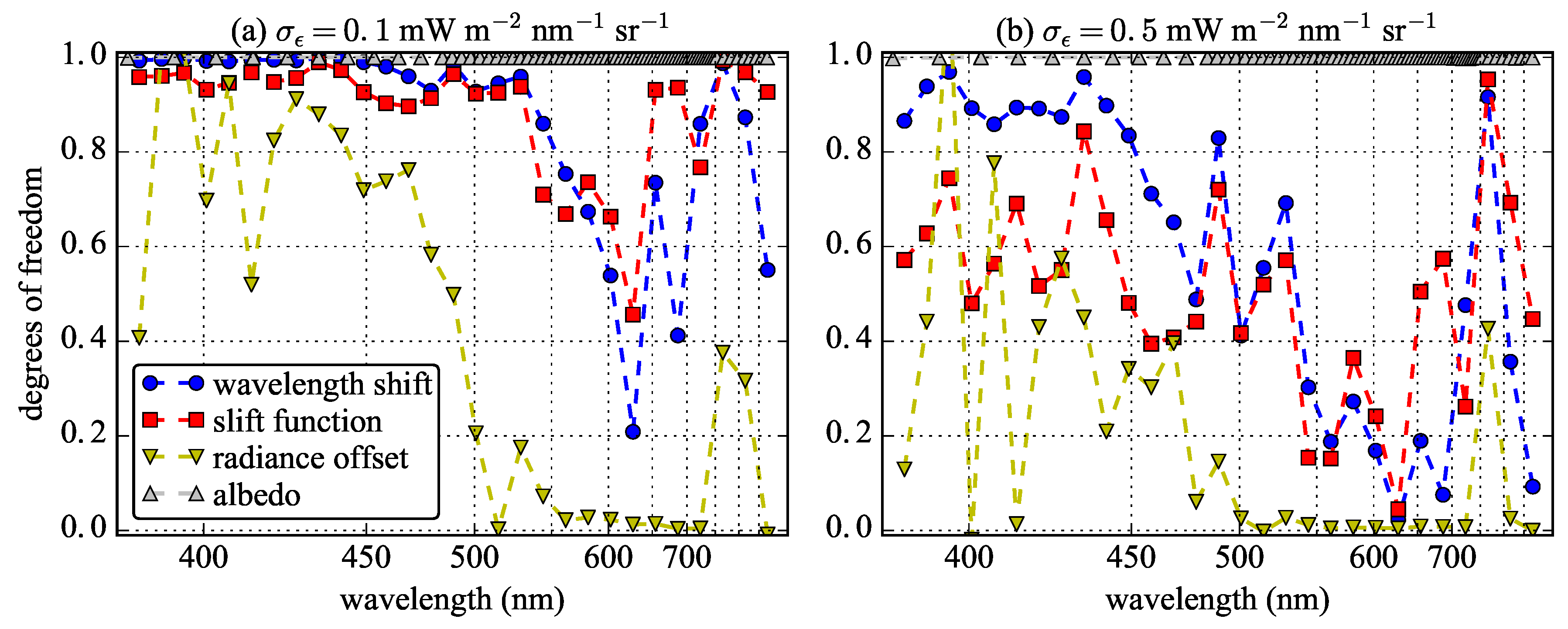 Figure 5. Degrees of freedom of the control points in the C-splines (wavelength shift, slit function, radiance offset and albedo) for small and large measurement errors.